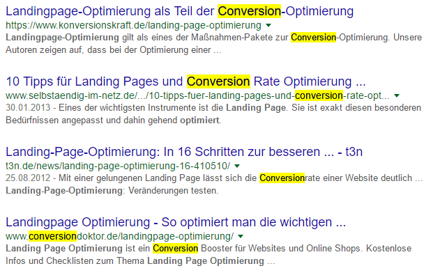 Suche dafür Deine Suchanfrage in Google. Beispielsweise ist „Landingpage-Optimierung“ das Thema dieses Blogposts. Wer das allerdings sucht, interessiert sich meist für Conversion-Optimierung – das implizieren die ersten vier Suchergebnisse. Ich bin also nicht relevant und sollte nicht dafür gefunden werden: